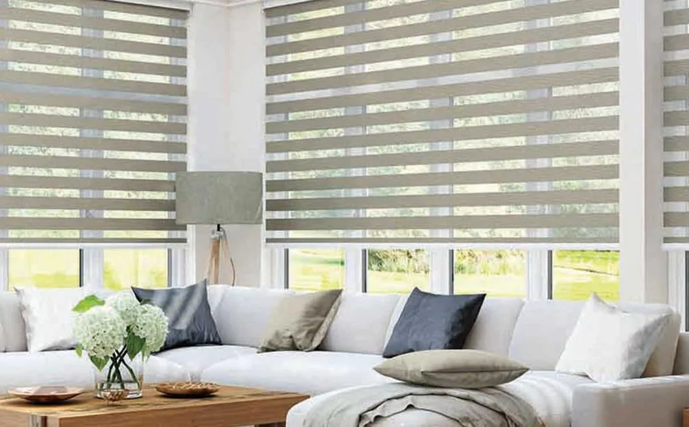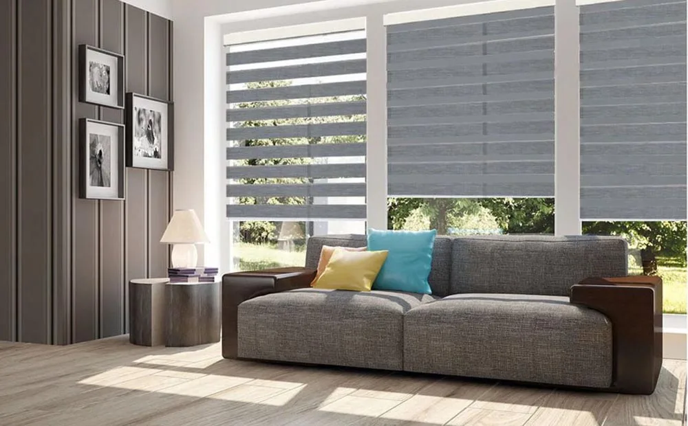 Zebra shades are similar to regular roller shades. Instead of a single piece of material, however, transitional window shades are made from two pieces of fabric, one sheer and one solid. Combine alternating stripes of sheer and semi-opaque or opaque fabric for a modern take on light control and style. When open, zebra shades let in softly filtered light, while closed bands offer superior light blocking for a clean, modern look.